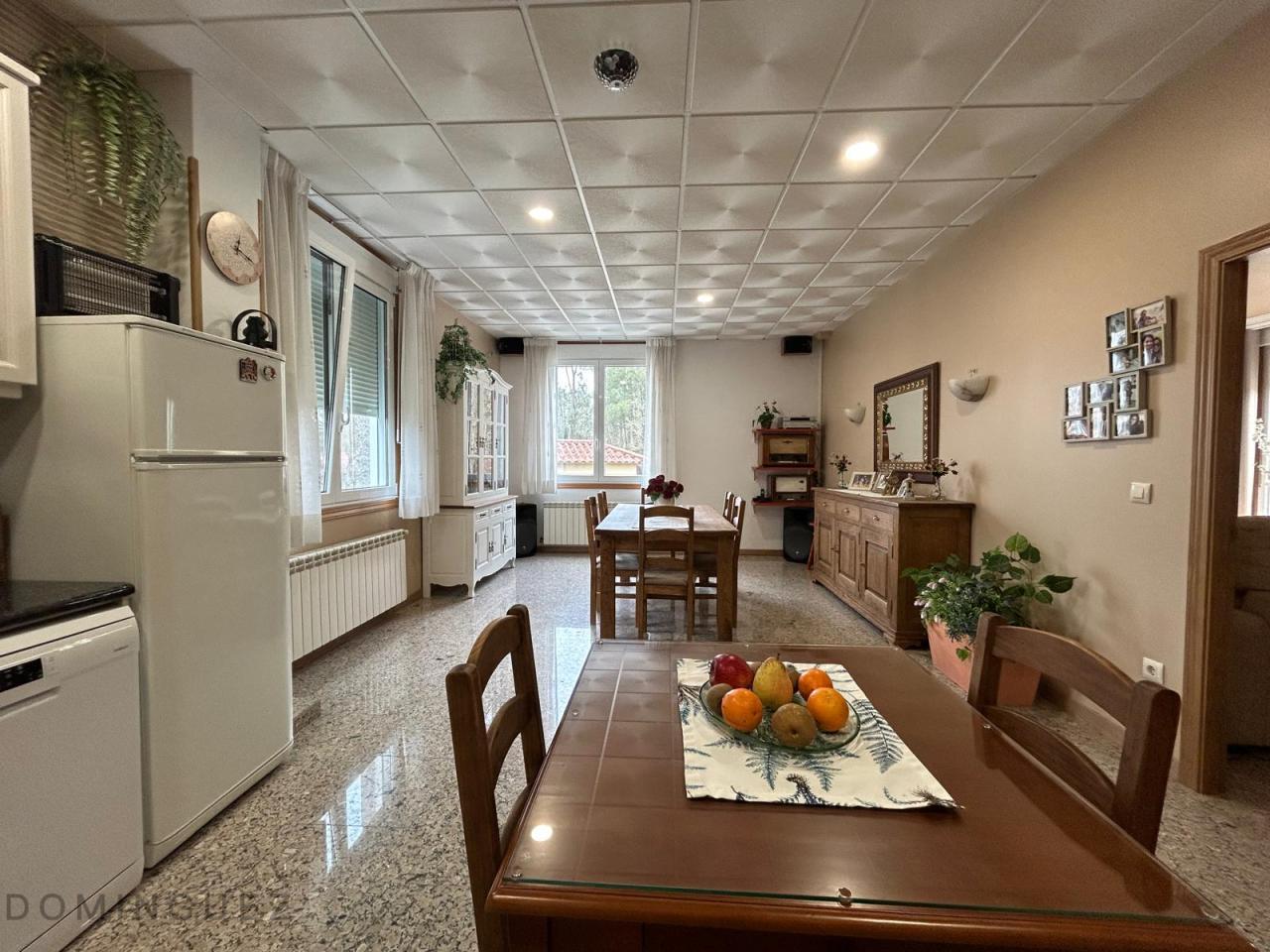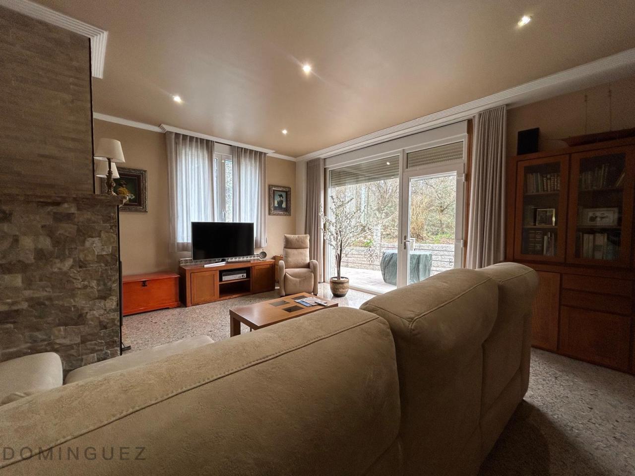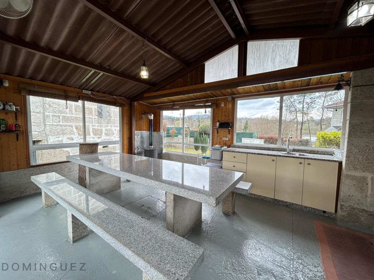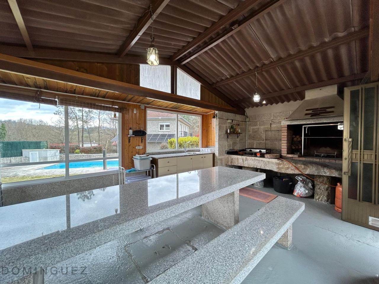 Esta propiedad, ubicada en la parroquia de Cristiñade, Ponteareas, cuenta con dos viviendas unidas con diferentes referencias catastrales y con acceso independiente. La casa principal, de 381 m², está construida con materiales de alta calidad y presenta muros de piedra que le otorgan un carácter rústico y acogedor. En la planta baja se encuentra un salón luminoso con chimenea que proporciona calefacción a través de radiadores, una cocina-comedor de 40 m² con electrodomésticos de última generación y un dormitorio principal en suite con baño privado. La planta superior alberga tres dormitorios adicionales, uno de los cuales está en suite, y un espacio adicional utilizado como despacho. Además, hay otro baño fuera de los dormitorios. El garaje, en la planta inferior, tiene acceso automático y capacidad para 4 coches. Además, la propiedad cuenta con una casa de piedra centenaria de 235 m² que actualmente se usa como almacén pero que tiene un gran potencial para restaurarse y convertirse en una vivienda independiente o un espacio adicional. La propiedad también dispone de un asador independiente en el jardín.